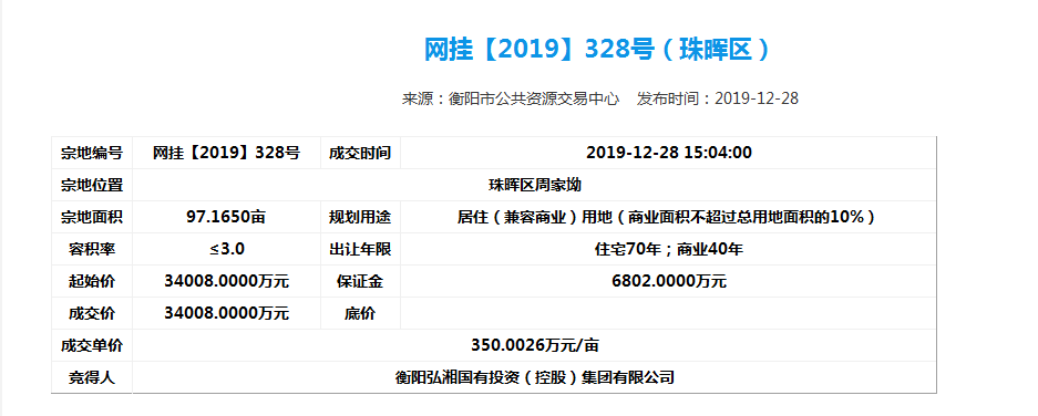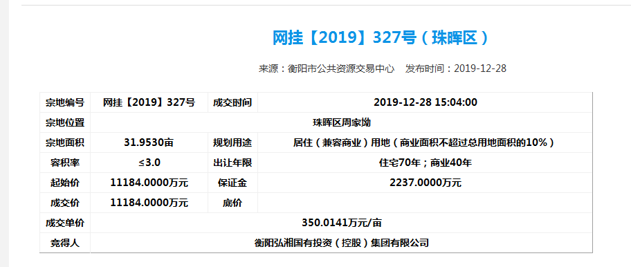 為了進(jìn)一步做好市場化運(yùn)行,弘湘國投以市場經(jīng)營為主體,向資本市場進(jìn)軍,進(jìn)一步做實(shí)做強(qiáng)國有資產(chǎn),增強(qiáng)自身活力。2019年12月28日下午,弘湘國投在市公共資源交易中心網(wǎng)站成功摘牌6宗共計(jì)523畝改制企業(yè)土地,摘牌總價(jià)超24億元,并于當(dāng)日簽訂了《國有建設(shè)用地使用權(quán)公開出讓成交確認(rèn)書》。2019年12月31日,弘湘國投與市自然資源和規(guī)劃局正式簽訂了《國有建設(shè)用地使用權(quán)出讓合同》。