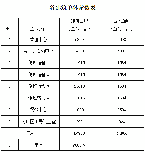 采購(gòu)項(xiàng)目?jī)?nèi)容包括:管理中心、食堂及活動(dòng)中心、倒班宿舍(暫定四棟)、餐飲中心、南廠區(qū)門衛(wèi)室、圍墻立面概念設(shè)計(jì),各單體參數(shù)如下表: