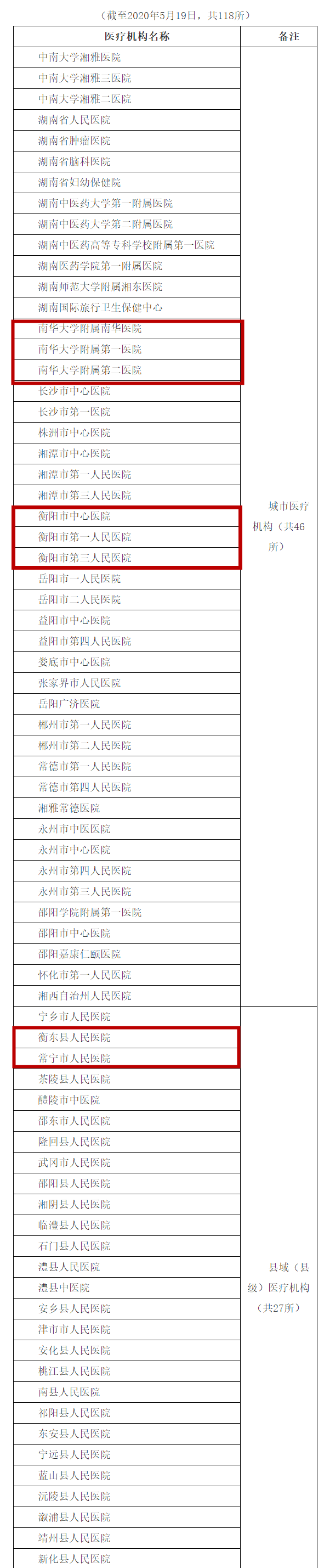 經(jīng)國家衛(wèi)生健康委臨床檢驗中心《新冠病毒核酸檢測信息平臺》查詢,湖南開展新冠病毒核酸檢測的醫(yī)療機構(gòu)名單5月19日下午公布。其中,衡陽有9家醫(yī)療單位可開展新冠病毒核酸檢測,他們分別是南華大學附屬第一醫(yī)院、南華大學附屬第二醫(yī)院、南華大學附屬南華醫(yī)院、衡陽市中心醫(yī)院、衡陽市第一人民醫(yī)院、衡陽市第三人民醫(yī)院、衡東縣人民醫(yī)院、常寧市人民醫(yī)院、衡陽市疾病預防控制中心。具體名單如下: