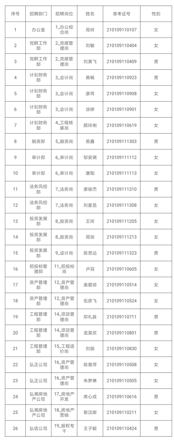 根據(jù)《衡陽弘湘國有投資(控股)集團有限公司2020年公開招聘員工公告》的規(guī)定,我司公開招聘員工按發(fā)布公告、報名、筆試、資格審查、面試、體檢、考察等程序,現(xiàn)確定26名擬聘用人員,并予以公示。