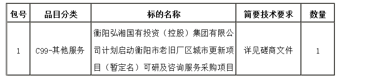 采購項目名稱:衡陽弘湘國有投資(控股)集團(tuán)有限公司計劃啟動衡陽市老舊廠區(qū)城市更新項目(暫定名)可研及咨詢服務(wù)采購項目