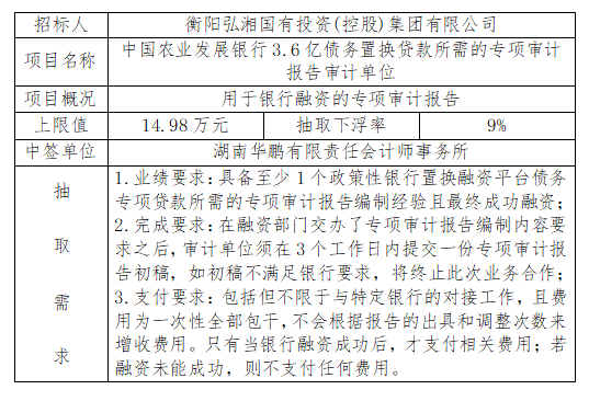 ?    中國農業(yè)發(fā)展銀行3.6億債務置換貸款所需的專項審計報告審計單位于2025年7月17日在衡陽國投4棟3樓評標室進行了隨機抽取,現將相關信息予以公示。