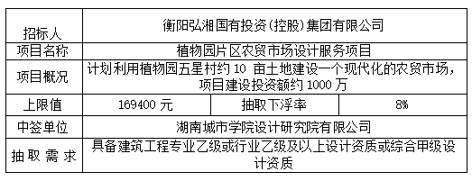 植物園片區(qū)農(nóng)貿(mào)市場設(shè)計服務(wù)項目于2025年8月1日在衡陽國投4棟3樓評標(biāo)室進(jìn)行了隨機(jī)抽取,現(xiàn)將相關(guān)信息予以公示。
